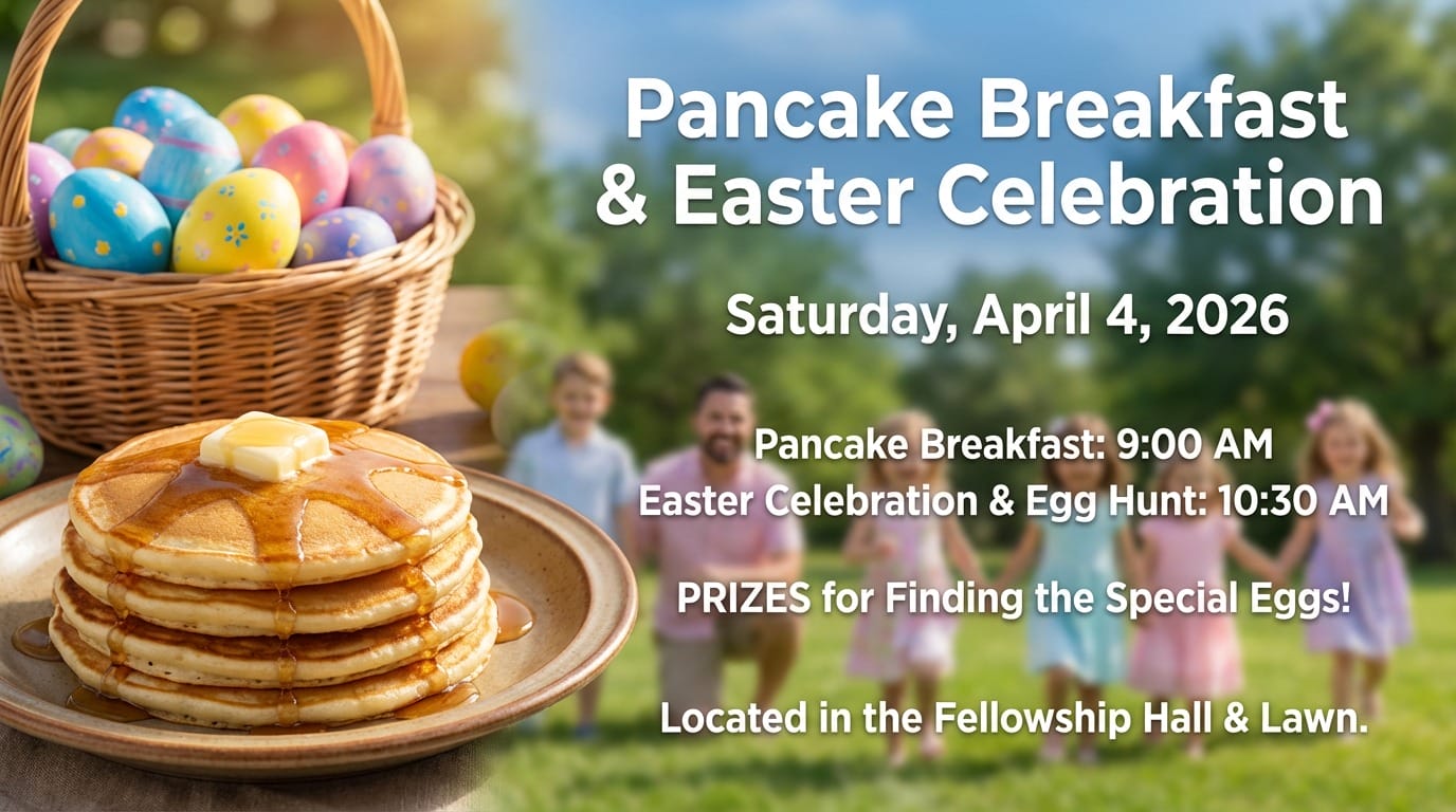 Pancake breakfast at 9:00 AM, followed by Easter Celebration and Egg Hunt at 10:30 AM. Prizes awarded after the hunt.