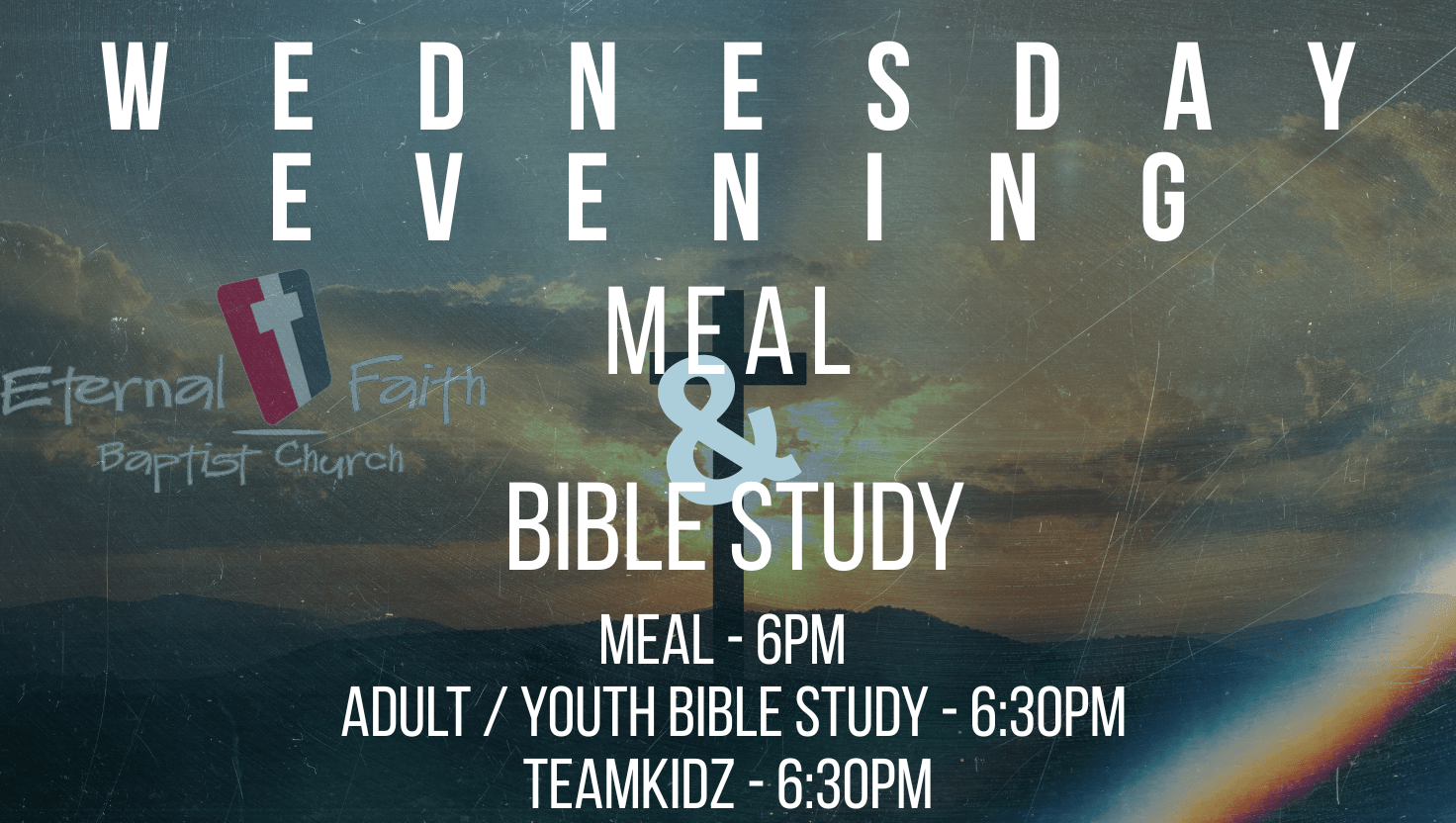6:00 PM Meal, 6:30 PM Adult Bible Study, 6:30 PM Youth Bible Study, 6:30 PM TeamKidz, 7:30 PM Choir Practice